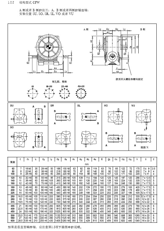 CFW蝸桿減速機(jī)采用輸出軸并配有輸出法蘭連接,隨意安裝。用戶選擇時(shí)可根據(jù)實(shí)際使用需要選擇合適的安裝方式,具體安裝形式及安裝尺寸如下圖所示