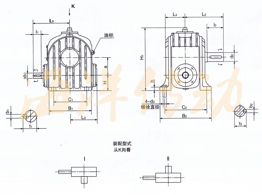 蝸桿轉(zhuǎn)速不超過1500r/min,蝸桿軸可正、反向運轉(zhuǎn),工作環(huán)境溫度為-40℃~+40℃,當(dāng)工作環(huán)境溫度低于0℃,啟動前潤滑油必須加熱到0℃以上,當(dāng)工作環(huán)境溫度高于40℃必須采取冷卻措施。