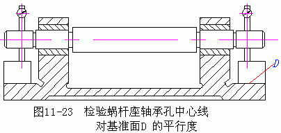 蝸桿座基準(zhǔn)面D可用專用研具刮研,研點應(yīng)為8~10/25×25mm2。檢驗軸承中心線對D面的平行度,如圖11—23所示,符合要求后裝入蝸桿,配磨調(diào)整墊片(補償環(huán)),以保證蝸桿軸線位于蝸輪的中央截面內(nèi)。與此同時,徑向調(diào)整蝸桿座,達到規(guī)定的接觸斑點后,配鉆鉸蝸桿座與底座的定位銷孔,裝上定位銷,擰緊螺釘。側(cè)隙大小的檢查,通常將百分表測頭沿蝸輪齒圈切向接觸于蝸輪齒面可工作臺相應(yīng)的凸面,固定蝸桿(有自鎖能力的蝸桿不需固定),搖擺工作臺(或蝸輪),百分表的讀數(shù)差即為側(cè)隙的大小。