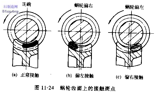蝸輪齒面上的接觸斑點應(yīng)在中部稍偏蝸桿旋出方向,如圖11—27a所示,若出現(xiàn)圖11—23b、圖11—23c的接觸情況,應(yīng)配磨墊付片調(diào)整蝸桿位置使用權(quán)其達到正常接觸。接觸斑點長度,輕負荷時一般為齒寬的25%~50%,不符合要求時,可適當(dāng)調(diào)節(jié)蝸桿座徑向位置。全負荷時接觸斑點長度最好能達到齒寬的90%以上。